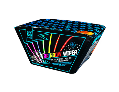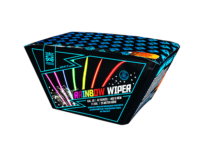 Batterie mit im schnellen Z-Fächer geschossenen Weißblinker-Feuertöpfen zu Farbkometen in 7 abwechselnden Farben, mit abschließender Finalsalve auf Schlag.