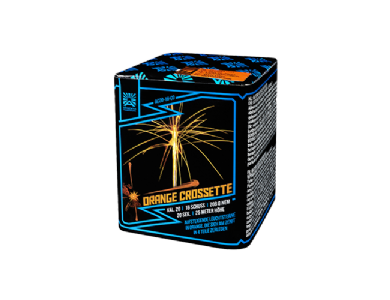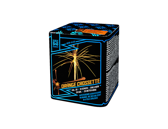 Batterie mit aufsteigenden Leuchtsternen in orange, die sich am Zenit in 4 Teile zerlegen.